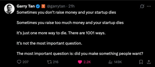 Garry Tan hablando de las miles de maneras que hay de morir en las startups (he experimentado muchísimas, incluso de las que comenta), pero también como el dictador final entre sobrevivir o no, esta en haber creado algo que la gente y tus clientes quieran.