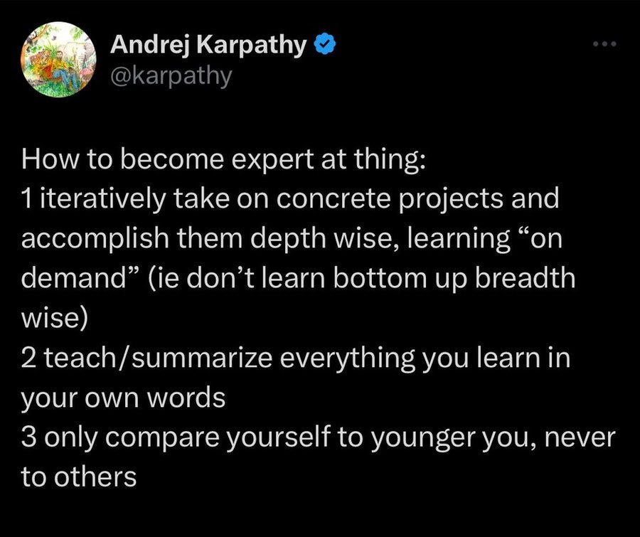 Andrej Karpathy es ex director de AI en Tesla, y además es una de las figuras clave en todo el mundo de AI. Hace unas semanas lo vi en un evento de YC en San Francisco, es un genio. Compartió en un tweet como convertirse un experto en cualquier tema.