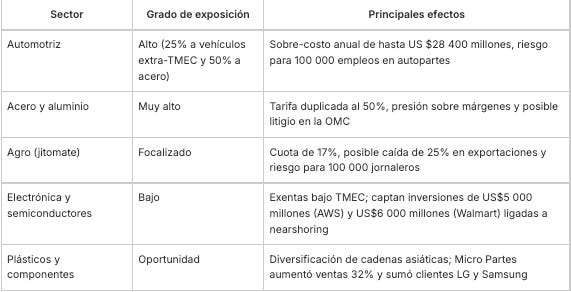 Aunque el FMI estima una contracción del PIB mexicano de -0.3%, sectores como semiconductores y plásticos ya están creciendo por efecto del nearshoring. Los aranceles pegan, pero no tumban la economía.